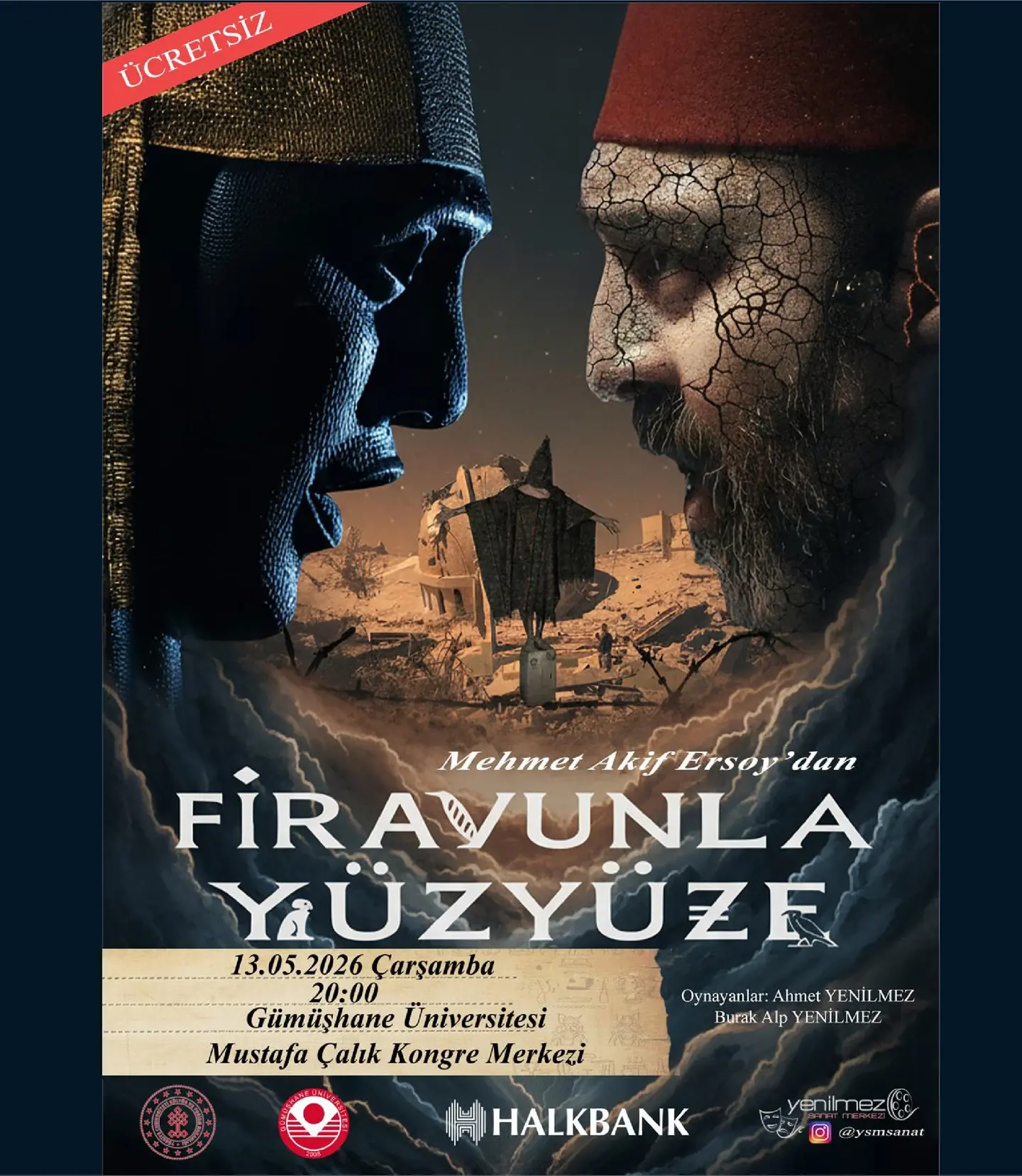 Yenilmez Sanat Merkezi tarafından titizlikle hazırlanan “Firavunla Yüz Yüze” tiyatro oyunu, Gümüşhane Üniversitesi Dr. Mustafa Çalık Kongre ve Kültür Merkezi’nde izleyiciyle buluşacak. Millî Şairimiz Mehmet Akif Ersoy’un zamana meydan okuyan eseri Safahat’ın ruhunu sahneye taşıyan oyunun, sanatseverlere unutulmaz anlar yaşatması bekleniyor.