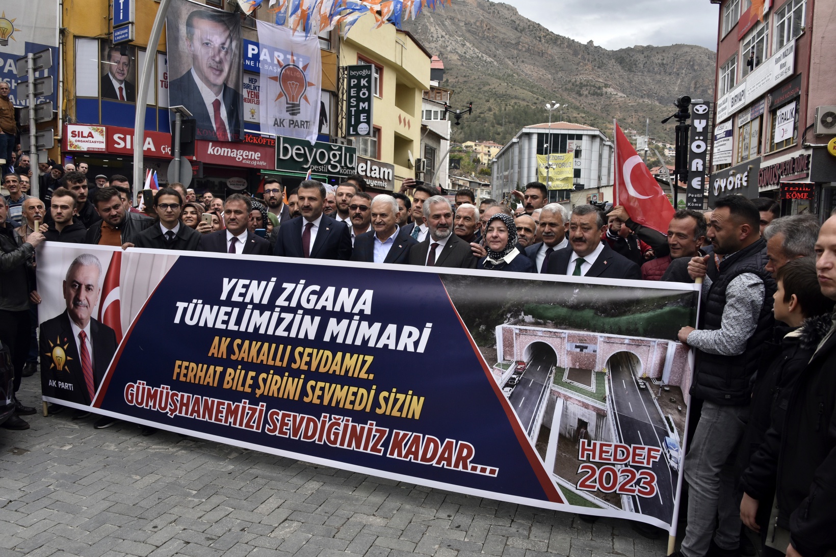 AK Parti döneminde Gümüşhane’ye yapılan yatırımları hatırlatan AK Parti Genel Başkanvekili Binali Yıldırım, “Vekil adaylarımızın çiçeği burnunda. Bu şehrin evladı Celalettin Köse ve Kelkit’in evladı Ünal Yılmaz. Onlara sahip çıkacak ve 14 Mayıs’ta Gümüşhane yeni bir destan yazacak. Coğrafya kader diye boynumuzu büküp bekleyecek halimiz mi var? O dağları dize getirir, tünellerle deler geçeriz, Gümüşhane’yi erişilebilir hale getiririz dedik ve yaptık. 3 Mayıs’ta Trabzon’u Gümüşhane’ye komşu kapısı yapacak büyük Zigana Tüneli açılıyor. 2017’de bir kış günü yağmurlu bir havada temelini atmıştık. Avrupa’nın en uzun tüneli daha uzunu yok. AK Parti yaparsa böylesini yapar. Gümüşhane-Bayburt Havalimanımız da eli kulağında bitti bitiyor. Bir yandan Pekün tüneliyle Kelkit, Vauk tüneliyle Bayburt’a yakınlaşacağız” ifadelerini kullandı.