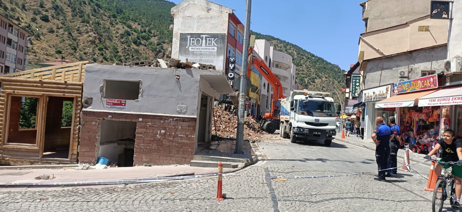 Gümüşhane Belediye Başkanlığı ekipleri, Atatürk Caddesi’nin İmamoğlu Sokakla birleştiği noktadaki baraka görünümlü işyerlerinin mahkeme sürecinden kaynaklanan geciken yıkımını tamamlamak üzere yoğun mesai yapıyor.