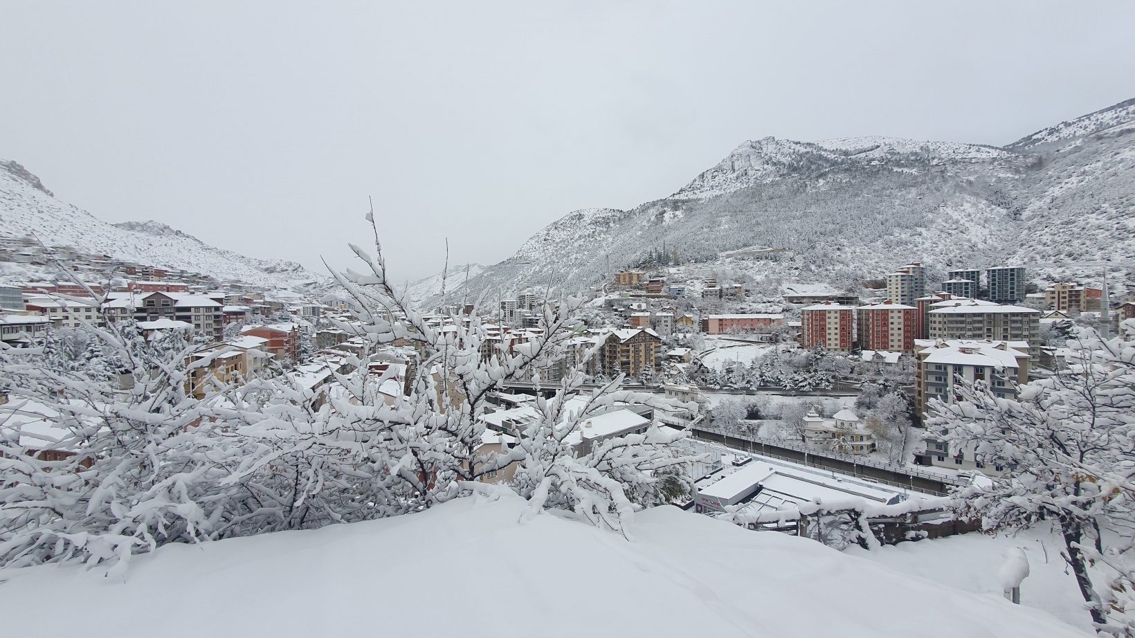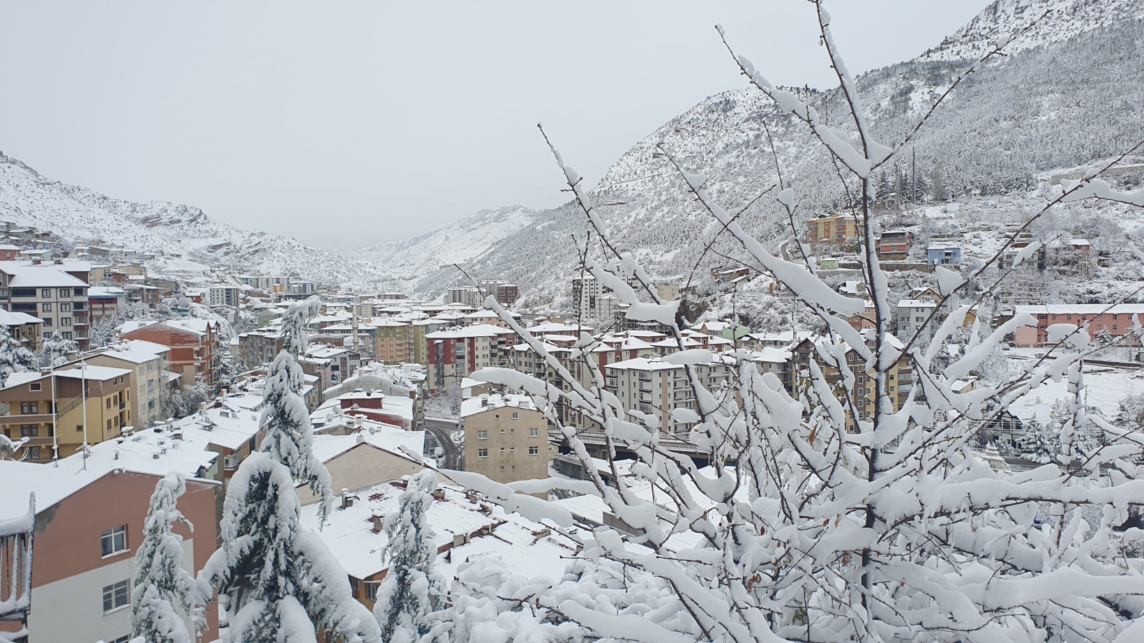 Gümüşhane şehir merkezi mevsimin ilk kar yağışının ardından beyaza büründü. Yağış nedeniyle çatılar, araçlar ve ağaçların üzerleri karla kaplandı.