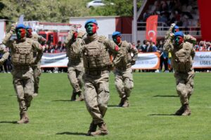 Kürtün Jandarma Asayiş Komando Bölük Komutanlığı’nın gösterisi ve Polis Özel Harekat Tören Yürüyüşü stadyumu dolduran vatandaşlardan izleyenlerden büyük alkış ve beğeni aldı.