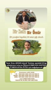 Ölümcül kas hastalığı DMD (Duchenne Musküler Distrofi) ile mücadele eden Kelkitli minik Eymen Kayra Petek için Türkiye’nin dört bir yanından destekler sürerken, anlamlı bir destek de Gümüşhaneli yazar ve mütercim Enes Akhan’dan geldi.