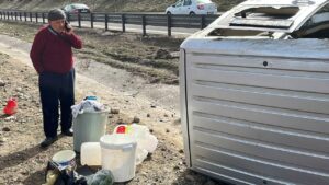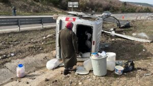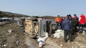 İstanbul’dan Gümüşhane’ye giden İlyas Ç. idaresindeki 29 AR 426 plakalı Ford marka hafif ticari araç, önünde giden aracın yavaşlamasıyla TEM Otoyolu Yeniçağa mevkisinde kontrolden çıktı. Otoyolun sol şeridinde seyreden hafif ticari araç, sürücüsünün direksiyon hakimiyetini kaybetmesiyle bariyerlere çarptı. Bariyerleri yerinden söken araç, refüjde takla attı.