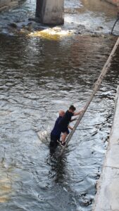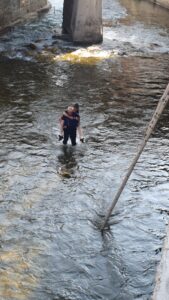 Bir itfaiye eri, merdiven yardımıyla çaya inerek küçük B.E.’ye ulaştı. Çocuğu sakinleştiren ve güvenliğini sağlayan itfaiye görevlisi sırtına aldığı çocuğu dikkatli bir şekilde yukarı çıkardı.