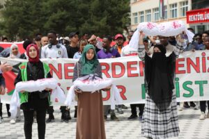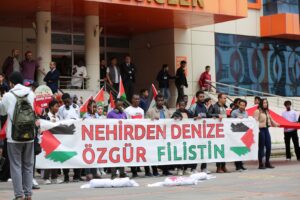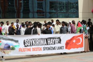 Gazze’de yaşananlar karşısında gösterilen tavırların devletlerin ve milletlerin tarihine silinmemek üzere kazınacağını vurgulayan Akkaya, “Bu süreçte kimlerin susup kimlerin konuştuğu ve kimlerin zulme ortak olduğu unutulmayacaktır. Türkiye, bölgesel barışın teminatı olarak, askerî gücünü bir barış elçisi misyonuyla Filistin halkının yanında konumlandırmalıdır. Bizler, gençler olarak, liderlerimizi katil İsrail’in karşısında durmaya, bu yolda politik anlamda somut adımlar atmaya ve onurlu bir tavır göstermeye çağırıyoruz. 7 Ekim’den bu yana hakkı çekinmeden haykırıyoruz ve haykırmaya devam edeceğiz: Netanyahu bir katildir. İsrail, yakın tarihin en örgütlü kötülüğüdür. Bugün üniversite öğrencileri olarak, madden ve manen katil İsrail’in karşısında duran bütün direnişçi kardeşlerimize selam gönderiyoruz. Bu uğurda şehit olmuş tüm kardeşlerimizi rahmetle yâd ediyoruz. Rabbimizin Kur’an’da buyurduğu: “Size ne oldu da Allah yolunda ve “Rabbimiz! Bizi, halkı zalim olan bu şehirden çıkar, bize tarafından bir sahip gönder, bize katından bir yardımcı yolla” diyen zavallı erkekler, kadınlar ve çocuklar uğrunda savaşmıyorsunuz?” âyetine gücümüz ölçüsünde icabet ederek katil İsrail ile mücadele etmek için elimizden ne geliyorsa yapacağımızı açık yüreklilikle beyan ediyoruz. Ve inanıyoruz ki: “İnsanlık vicdanı, Siyonizmi yenecektir.” ifadelerini kullandı.