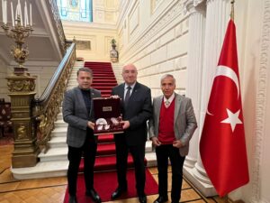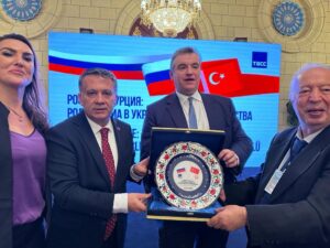 Bu arada, KGK heyeti adına Genel Başkan Mehmet Ali Dim tarafından Zaharova, Karasin, Kondraşov ve Gusman ile Slutskiy’e Türk geleneksel seramiğinden özel imal edilmiş birer anı plaketi ile KGK resmî yayın organı Küresel Medya dergisi ve KGK flaması takdim edildi.