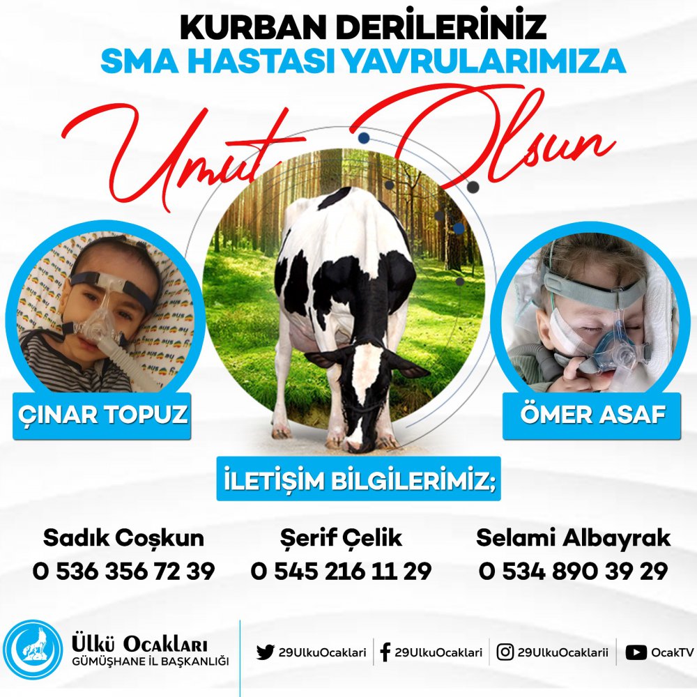 Bu yılda harekete geçen Ülkü Ocakları İl Başkanlığı Gümüşhaneli SMA hastaları Ömer Asaf ve Çınar Topuz bebek için Kurban Bayramında büyükbaş hayvan derilerini toplayarak gelirini iki çocuğumuzun resmi Valilik hesabına yatıracak.