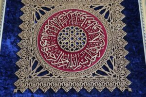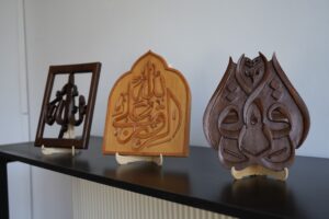 Sedef Kakma Sanatının manevi yönlerinden de bahseden Fatih Öztürk, “Arkamızda gördüğümüz Allah lafzının yapımı yaklaşık bir buçuk iki ay sürmektedir. Dış kenar bölümlerindeki süsleme, Naht sanatı diye geçen kıl testereli ahşap oyma bölümüdür. Onun akabinde orta bölümde ceviz ağacının içine az önce bahsettiğim gibi sedeflerin kesilerek ahşap üzerine oylu yapılıp yuvalarına yerleştirilmesiyle oluşmuş bir tablodur. Dediğim gibi yaklaşık bir buçuk iki aylık bir serüveni vardır o tablonun. Diğer yeşil olan tablomuzda ise Ahzab Suresinin 56. ayeti işlenmiştir. Hani halkımız genelde bunu cuma hutbelerinde imamın hutbeye çıkarken okuduğu sure olarak bilinir. O da yaklaşık yine 1-1,5 aylık bir emeği ürünüdür. Hocam der ki testeremizin, kıl testeremizin üst kısmı gök, yer kısmı, alt kısmı yerdir. Ve dünya üzerinde de, alem üzerinde de yerle gök arasındaki her şey Allah’ı zikreder. Biz de çalışırken bu uhreviyatla çalışmaya çalışıyoruz. İnsanı rahatlatan, insana dinginlik veren, insanı terbiye eden bir yönü vardır bu sanatın. Osmanlı döneminden de bu böyle gelmiştir. Günümüzde de böyle devam etmektedir. Biz de aynı düsturla devam etmeye çalışıyoruz. Bizler bunları satmak için yapmayız. Kendi kafamızda oluşturduğumuz şablonlarla veya ortaya çıkartmaya çalıştığımız çalışmayla bir ürünü ortaya koyarız. Nasibi Allah’tandır der, bekleriz. Talibi varsa vakti geldiği zaman bu eserler ya da bu çalışmalar yerini bulacaktır” diye konuştu.