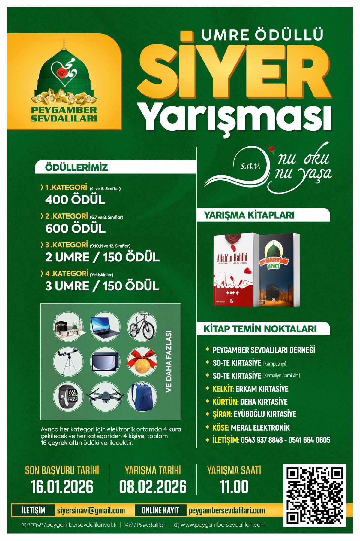 Arslan açıklamasının devamında, “Bu anlamda Siyer Yarışmasına 7’den 70’e herkes katılabilir. Yarışmamız dört farklı kategoriden oluşmakla beraber soncunda Umre ödülleri bulunmakta. Elhamdülillah geçtiğimiz yıllarda Gümüşhane’den yarışmacılarımızı Umreye gönderdik. Gümüşhane’mizin insanı Peygamber’e (sav) sevdalı insanlar. Her sene yaptıkları onlarca Türkiye geneli derece ile bunu çok güzel ifade ediyorlar. Bu manada tüm her yaştan tüm Gümüşhaneli kardeşlerimizi yarışmaya katılmaya davet ediyorum. Katılımcılar yarışma kaydı ve detaylı bilgi için, www.peygambersevdalilari.com internet sitesini ziyaret edebilirler veya 05439378848 numaralı iletişim numarasından bilgi alabilirler” dedi.